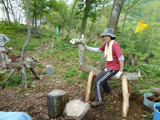 作業内容 入梅後の初めての例会。幸いにも好天に恵まれ、多義に渡る作業が出来た。 まず、植栽地に入る前、林道にナンキンハゼを植えた。そもそも街路樹として大陸から入ってきた外来種ということから、あえて林道に定植した。 植栽地に移動し、伐倒した枯木の整理・モニュメント製作・害虫の駆除、の三チームに分かれ9時前に作業開始。 モニュメントは倒木を利用したシカやアンパンマンなど「遊び心」を活力に「一服の癒し」になればと云うことでチエンソーでカットし休憩地に製作、設置した。 一方、害虫の駆除班は別添の写真のごとく、権現での作業始まって以来となる異常なまでのケムシの大量発生。今年は雪が少なかったせいか・・、温暖化によるものか、ミズナラやブナ・カエデ等々、ところ構わず網の目状態に食い荒らされてしまった若葉には目を覆わんばかりの様が広がっている。 広大な面積で消毒するわけにもいかず、とりあえず植栽木に取り付いたケムシの一匹一匹を人海戦術で取り除いた。 冬には一メートルを超す積雪、春にはウサギやシカなど異常発生した動物による食害、加えて今回の害虫による食害等々、自然のおきてとはいえ森林づくり活動の難しさを実感させられる。 色々な課題を残し、午後二時作業を終わり下山した。 |