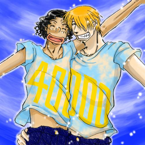 などというウソップの疑問はすぐに解けた。思い切り二人がくっつけば、ロゴはちょうど合わさって四万になるというデザインらしい。